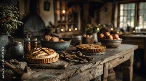 Rustic farmhouse kitchen counter with freshly baked bread, pies, and seasonal fruit. Thanksgiving preparation