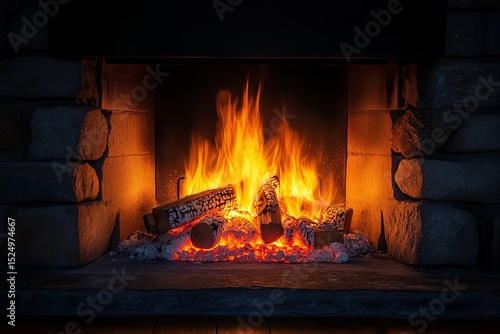 Rustic stone fireplace with glowing firewood flames in cozy wooden cabin interior creating warm and inviting atmosphere