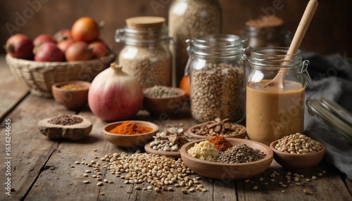 Rustic table displays variety of natural ingredients including fresh vegetables, herbs, spices, peanut butter. Healthy food concept rich in vitamins. Organic cooking products for home kitchen