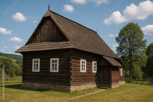 Rustic timber cottage in a rural village setting