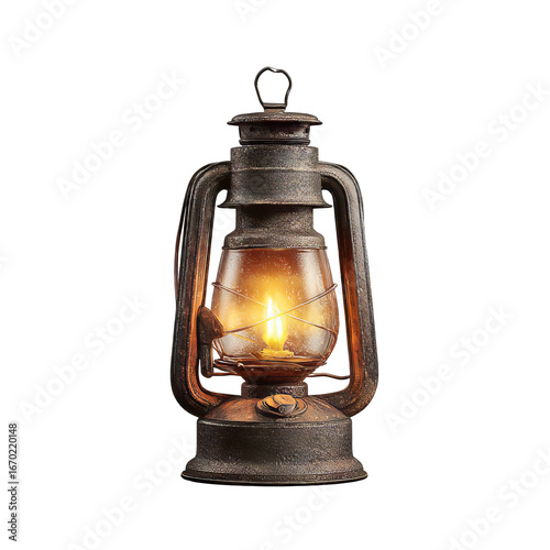 Rustic vintage lantern with glowing flame and weathered metal frame isolated on transparent background