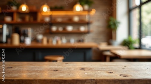 Rustic Wooden Tabletop in a Cozy Cafe Setting with a Blurred Background of Shelves, Counters, and Warm Lighting