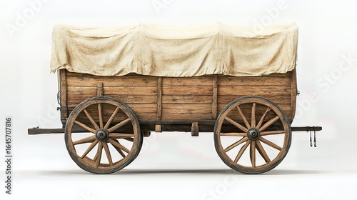 Rustic Wooden Wagon with Canvas Cover Detailed 3D Render Isolated White Background. Vintage Cart