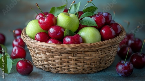 Rustic Woven Basket Filled with Juicy Cherries and Crisp Green Apples, a Delightful Still Life Composition