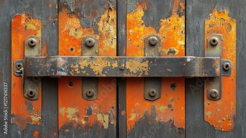 Rusty metal door with peeling orange paint and weathered hardware elements including a latch, vertical wooden planks, and Copy Space.
