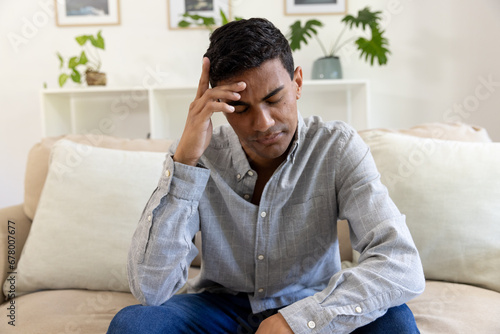 Sad biracial man sitting on sofa having video call at home