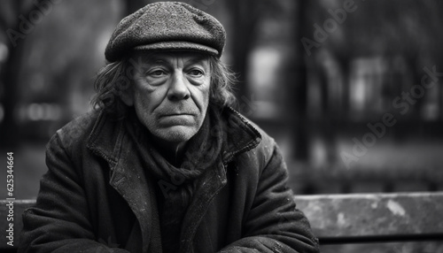Sad old man in knit cap looks worried, alone in city generated by AI