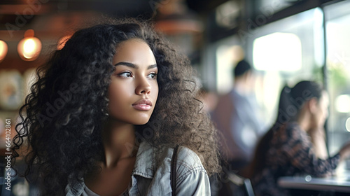 sad woman, woman has curly, brown hair that is styled in a way that frames her face. looking at something or someone with interest. enjoying her time at the restaurant