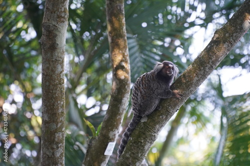 Sagui monkey in the wild. White tufted ear Marmoset in Rio de Janeiro, Brazil.