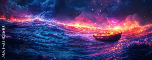 Sailboat navigates fiery ocean waves under starry sky with vibrant colors
