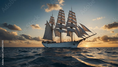 Sailing ship with billowing white sails, gliding across a calm ocean at sunset.