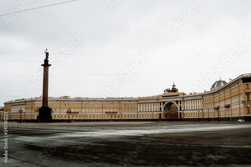 SAINT PETERSBURG, RUSSIA - APRIL 26, 2020: Panorama of the Palace Square in St. Petersburg. Photo of the palace cloak in cloudy weather. Alexander's Column on Palace Square in St. Petersburg.