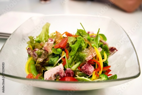 Salad with bacon on transparent dish.