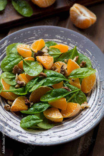 Salad with fresh spinach, sliced mandarins and walnuts, close-up