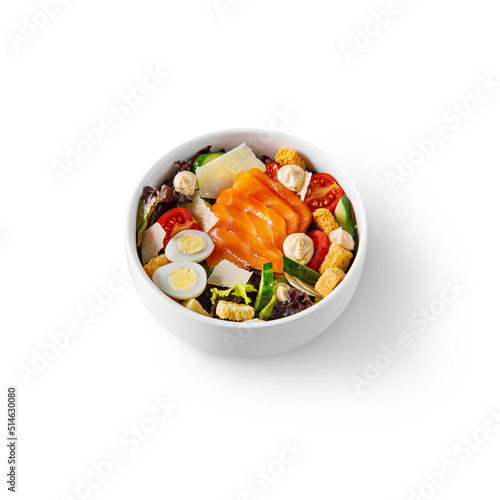 Salad with salmon, eggs, cheese, tomatoes, lettuce, croutons
