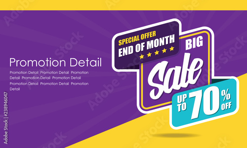 Sale banner template design, poster, Special Offer And Of Month, discounts, up to 70% off. Vector illustration. Store label. Communication poster