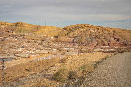 Salt mines in Morocco with earthy yellow and red hills forming a striking backdrop to the industrial landscape under a muted sky