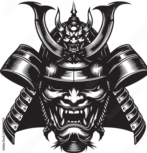 Samurai helmet with oni mask black and white vector