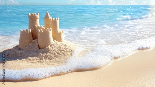 Sandcastle on a sandy beach with waves creates a perfect seaside scene, highlighting the beauty of a sandcastle as waves gently lap the shore. Ample space for text.