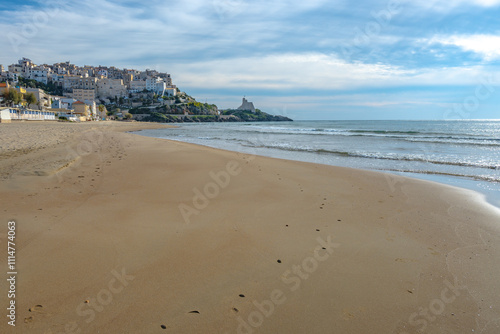 Sandy beach of medieval small touristic coastal town Sperlonga and sea shore, Latina, Italy