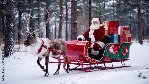 Santa Claus delivers Christmas and New Year gift boxes on a reindeer sleigh. Winter forest with snow.