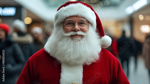 Santa Claus holding a shopping map in front of a directory sign surrounded by curious onlookers in a shopping center