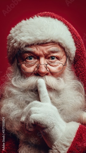 Santa Claus in festive attire holding a finger to his lips with a playful expression during Christmas season