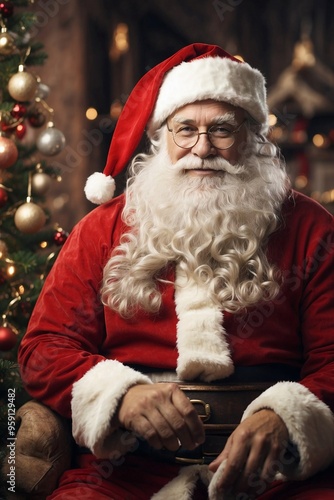 Santa Claus Sitting in Front of a Christmas Tree, Joyfully Distributing Gifts