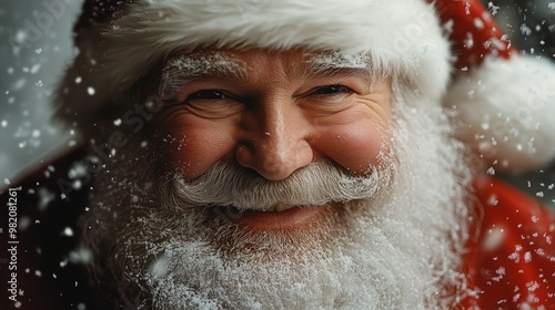 Santa Claus smiling and looking at the camera, magical atmosphere background with snowflakes falling