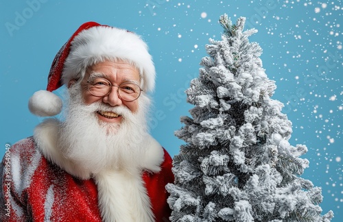 Santa Claus stand next to the Christmas tree on blue background