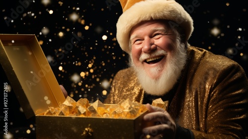 Santa claus unwrapping a beautifully wrapped christmas gift under the captivating starlit night sky