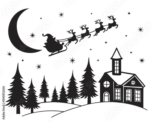 Santa Sleigh Reindeer Flying Over House Moon Trees Silhouette Vector SVG PNG Clipart