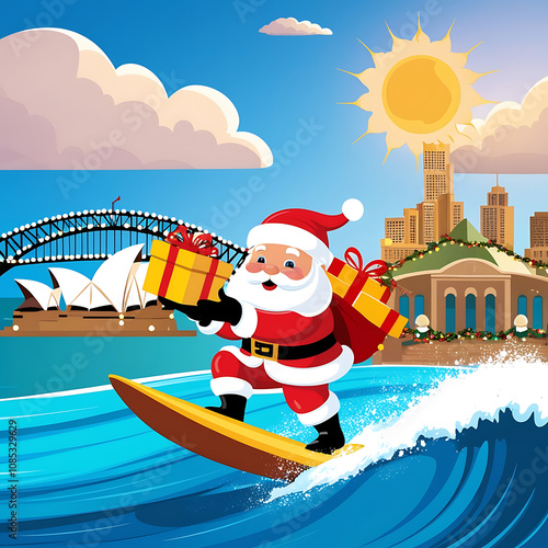 Santa surfing in Sydney, Australia, with presents.