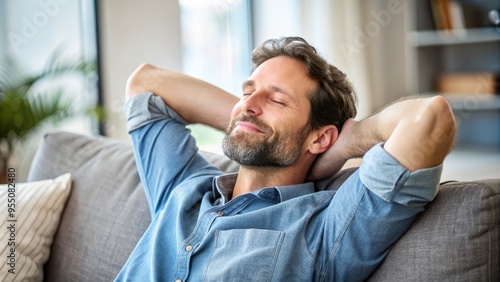 Satisfied Caucasian man sitting comfortably on a couch with a calm expression, eyes closed, and hands behind his head, surrounded by a peaceful atmosphere.
