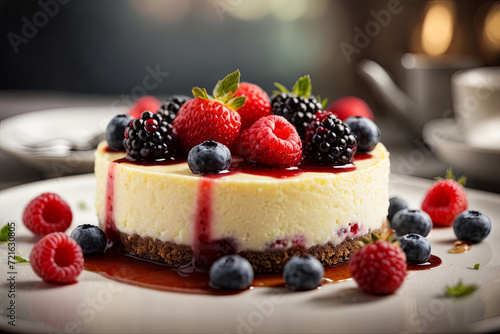 Satisfy your sweet cravings with a luscious cheesecake adorned with vibrant berries. A delightful dessert capturing the essence of indulgence.