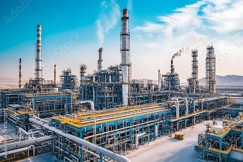 Saudi Arabian oil refinery factories with pipelines and storage tanks, emphasizing large-scale energy production and refining operations.