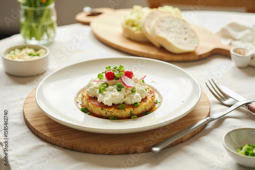 Savor Authentic Potato Pancakes: Crispy Golden Brown Pancakes Topped with Fresh Cottage Cheese, Sliced Radishes, and Green Onions, Offering a Delightful, Savory, and Traditional Meal Experience.