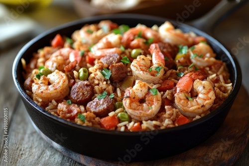 Savory and spicy Cajun jambalaya loaded with shrimp, sausage, rice, and vibrant vegetables in a rustic cast iron skillet