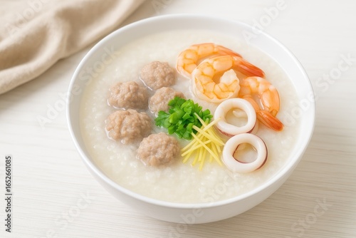 Savory rice porridge featuring pork, seafood, and squid pieces