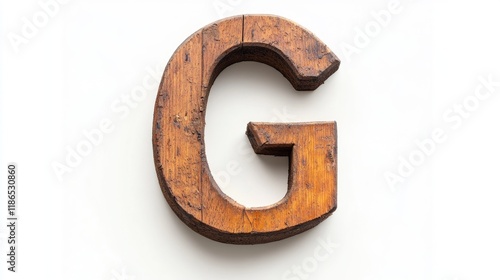 Sawn wooden letter G symbol with a rustic finish isolated on a white background ideal for artistic design and typography concepts