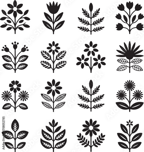 scandinavian, style, folk, art, flowers, botanical, silhouettes, floral, nordic, traditional, plant, nature, decorative, ornament, pattern, icon, set, simple