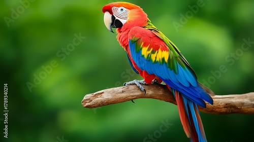 Scarlet macaw perched on a branch with a blurred green background