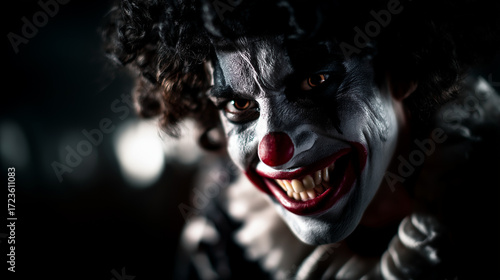 Scary clown dark background horror character frightening makeup Halloween horror themes evil clown costumes nightmare fuel blurred background with copy space