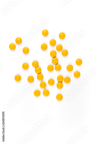 Scattered orange yellow pills over a white background