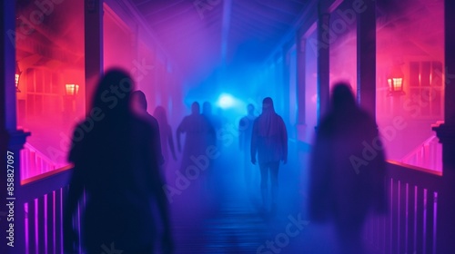 Scene of a haunted house tour, visitors walking through dimly lit rooms filled with spooky decorations, ghostly figures appearing around corners