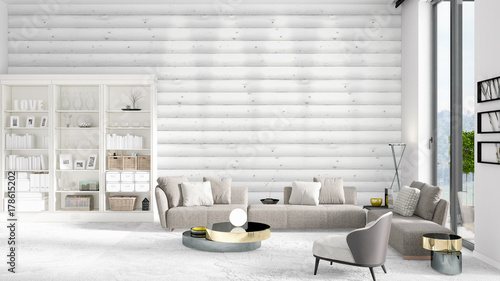 Scene with brand new interior in vogue with white rack and modern grey sofa. 3D rendering. Horizontal arrangement.