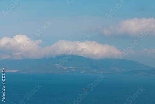 Scenic coastal landscape with a calm blue ocean and distant mountains under a cloudy sky. Tranquil seascape with a large island in the background.