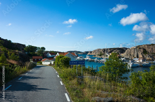 Scenic coastal road in Hamburgsund, Sweden, with a view of the marina, sailboats, and red-roofed houses. A peaceful summer landscape with rocky cliffs and lush greenery under a blue sky