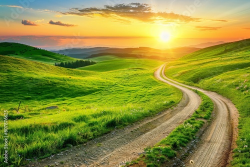 Scenic highway leads to a sunset-lit mountain range on an open road journey. Beautiful simple AI generated image in 4K, unique.