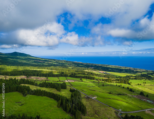 Scenic landscape with mountains and ocean of Sao Miguel Island, Azores, Portugal. Aerial drone view of panoramic Acores islands